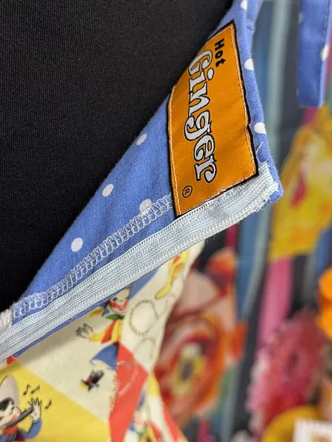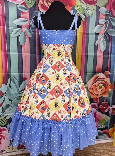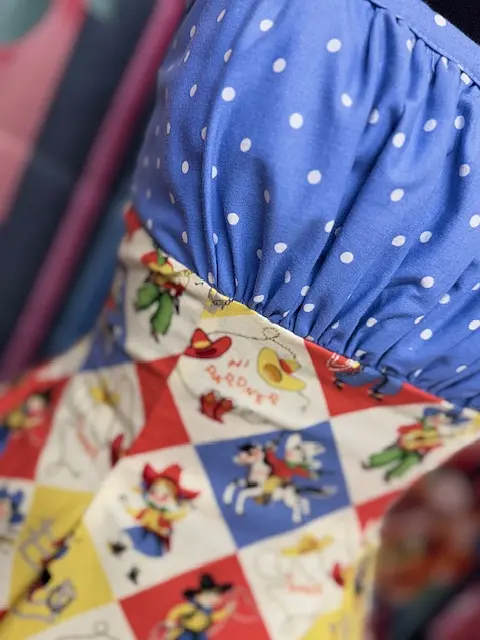 A playful, one-of-a-kind sample from Hot Ginger® — the Yee Haw dress blends cheerful vintage prints with a classic swing silhouette. Featuring a bright patchwork cowboy motif and blue polka dot accents, this size 12 sample is a true original.